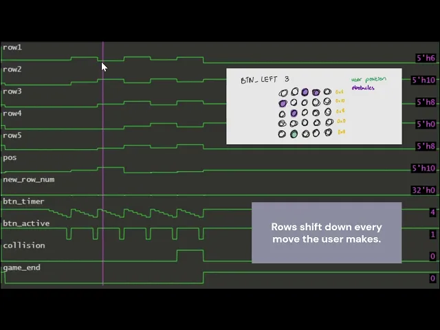 The goal of the game is to move left, right or stay still, based on the new row inputs above you. Every move will cause the rows to shift down. If the user (represented by the LED on the bottom row) hits an obstacle, the game ends.